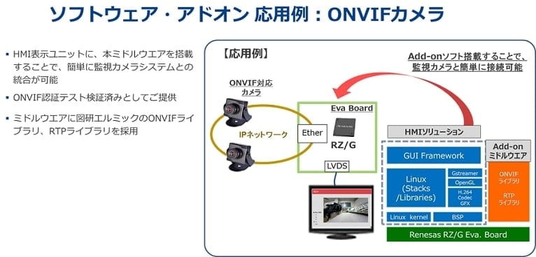 - Profile S(IPcam, Ipmon)対応。バージョンの互換性が容易になり、かつ最小限の機能を選んで搭載できるため省フットプリントによるコスト削減効果