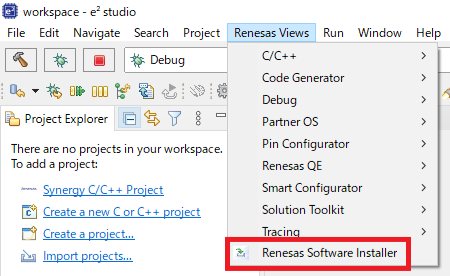 Click [Renesas Views], and then click the [Renesas Software Installer] menu to open the [Renesas Software Installer] dialog box.