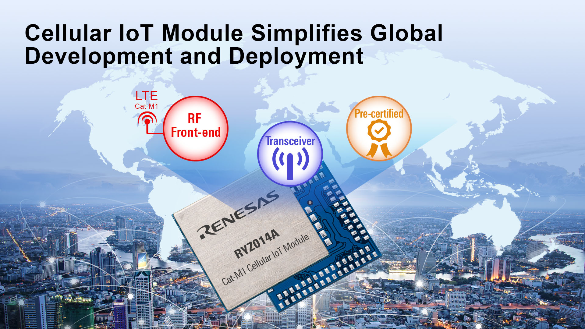 The RYZ014A module solves customers’ design and certification issues compared to building a wireless IoT solution from scratch. This includes RF regulatory certification, PTCRB/GCF certification and carrier certification for the customer’s network operator of choice. The module is built on proven technology both from a hardware and software perspective and is delivered fully tested and calibrated. It has been certified with all major radio frequency regulations in the world as well as with leading network operators in North America, APAC and Europe. Cellular IoT is one of the pillars of Renesas’ connectivity strategy that also includes Bluetooth® Low Energy, Ultra-wide band (UWB) and Wi-SUN among others.
