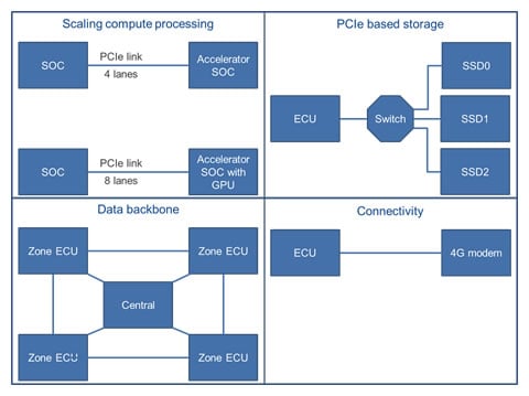 This use case is a very traditional PCIe one where PCIe is used for Chip-to-Chip communication inside an ECU. The application field could vary from high resolution display processing to image recognition to neural network applications. PCIe allows the building of a modular processing architecture with the scalability and virtualization features provided. Data exchange rates can be increased by adding additional lanes to the PCIe interface without changing the entire application. With this capability, high transfer rates without significant processor interaction are possible. Virtualization support and extended features like SRIOV and ATS give the developers tools at hand that also cover safety and security aspects.
