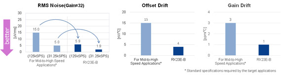 在产品所针对的中高速应用中,有数据采集 (DAQ)、力传感器等不同类别的应用。 这些应用要求支持最快 10 微秒(相当于 100kSPS)的测量,并需要具备高速和低噪声性能。 RX23E-B 可以完全满足此类应用所需的标准规格。