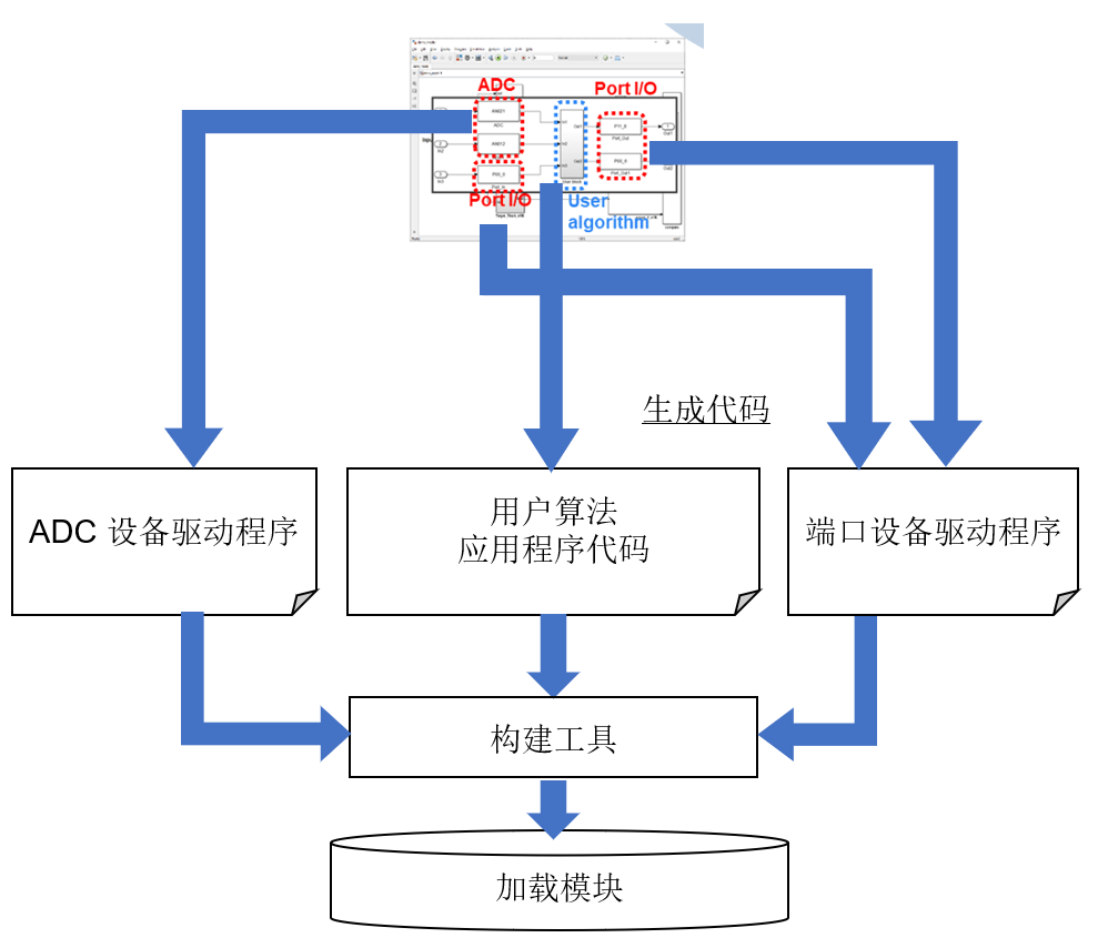 随后,将生成设备驱动程序(用于控制外设 IP)、应用程序代码(来自控制器块中的用户算法块),这些程序和代码将包含在构建环境中,并通过构建工具自动生成加载模块(图 5)。