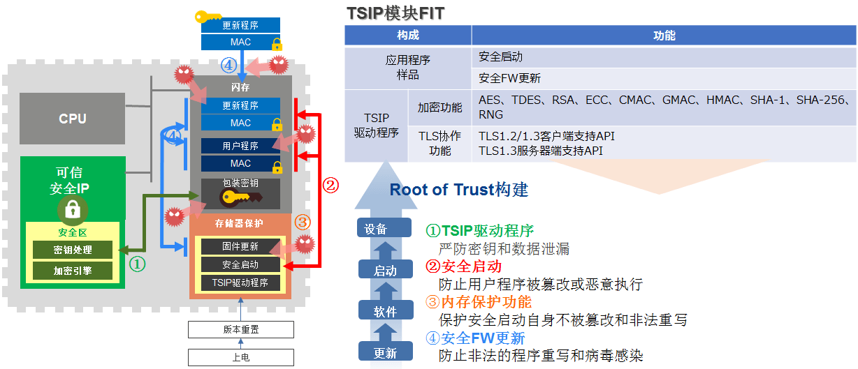 基于TSIP的RX单片机安全解决方案包括3个软件示例,包括高开发难度的安全驱动程序、安全引导程序和安全FW更新,可帮助降低安全部署阻碍,同时构建Root of Trust,保护您的资产免受各种威胁。