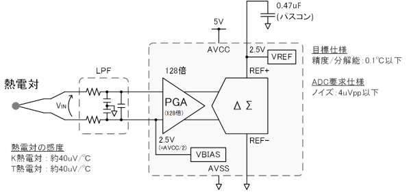 噪声性能是传感器测量中一个重要的技术参数。RX23E-A在其主要应用领域的温度测量和应变测量中,特别要求能够具有低噪声的特性。 例如,典型热电偶温度传感器的灵敏度在常用的K型热电偶和T型热电偶中为40uV/℃左右。相比之下,工业用途的温度测量要求精度/分辨率不大于0.1℃。这意味着,要使用K型热电偶或T型热电偶构建精度/分辨率为0.1℃或更低的测量系统,必须将ADC噪声控制在4uVpp或更低。