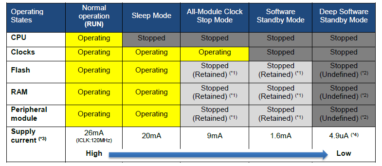 本次的目标RX65N可以转换成以下5种运行和待机模式。 您可以为要开发的应用程序匹配最佳待机模式,选择最适合的模式。