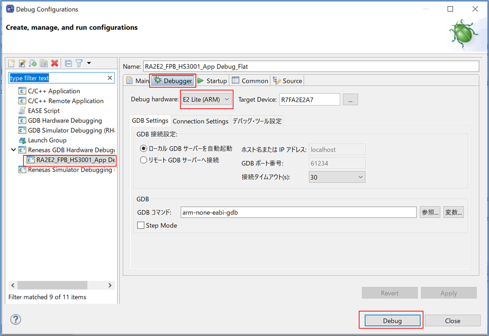 Select the target sample project, confirm that "E2 Lite(ARM)" is selected for Debug hardware in the "Debugger" tab, and click "Debug.