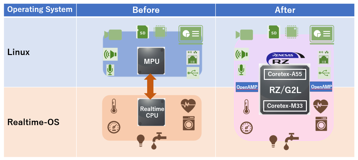 Therefore, RZ/G2L integrated Arm® Cortex®-A55 which handles advanced applications on Linux, Cortex-M33 which processes the data of several sensors in real-time, and an AD converter that can be directly connected to analog sensors inside.