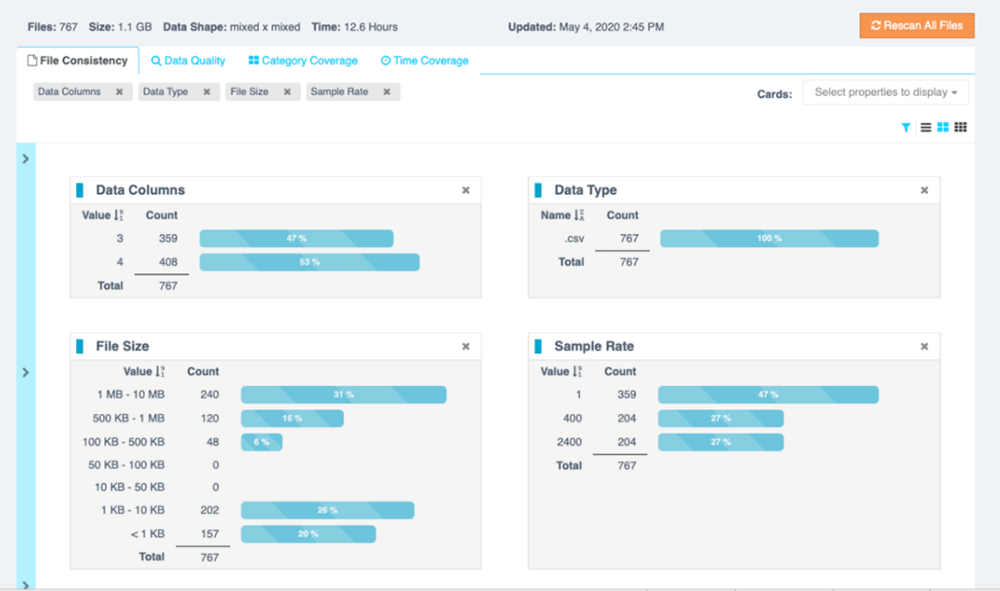 File size, file type, number of data columns, sample rate, and other file-level demographics. Inconsistencies in these categories can indicate systemic problems in data collection or in post-collection processing.