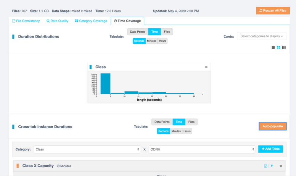 Cumulative statistics describing data in terms of time-in-class for key target and metadata categories. This is particularly useful for looking at data coverage for real-time streaming applications when the length of the decision window or smoothing methods are under evaluation.