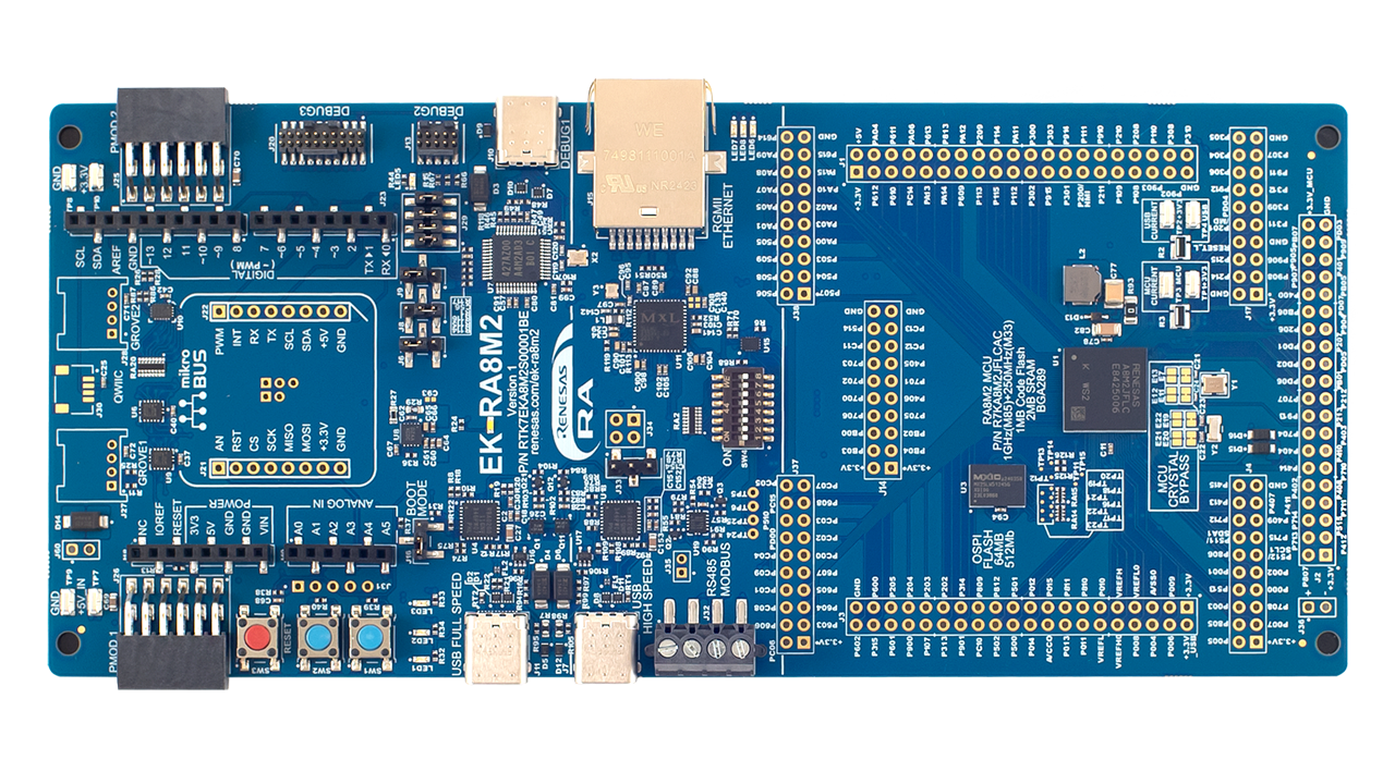 该套件具有丰富的通信接口,如以太网、USB、RS485/MODBUS 和 CAN FD,可快速开发网络应用。 该套件预先编程了演示,以展示 RA8M2 的卓越性能,以便用户可以在开箱后立即评估 RA8M2 的功能。