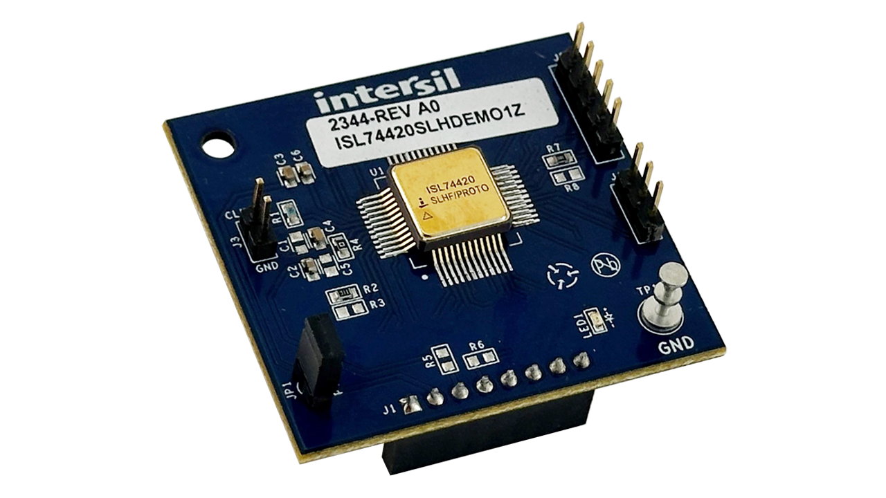 Featuring the hermetic version of the ISL74420SLH, the ISL74420SLHDEMO1Z is an example of a small footprint layout with SMD resistors to provide user-defined power-up configuration. It is functionally similar to the ISL74420SLHEV1Z evaluation board which provides mechanical switches for configuration. This eases user experimentation of frequency and delay selections and other configuration options.