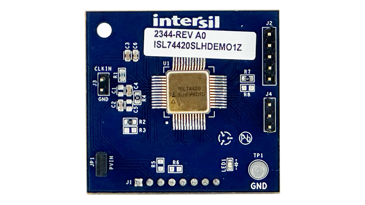 The ISL74420SLHDEMO1Z demonstration board is used to demonstrate the stand-alone operation of the ISL74420SLH radiation hardened, quad-output clock fanout IC.