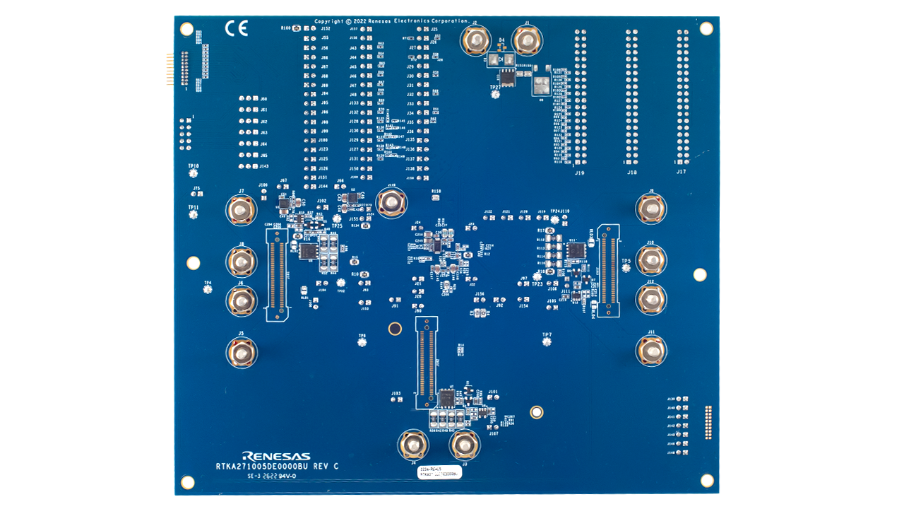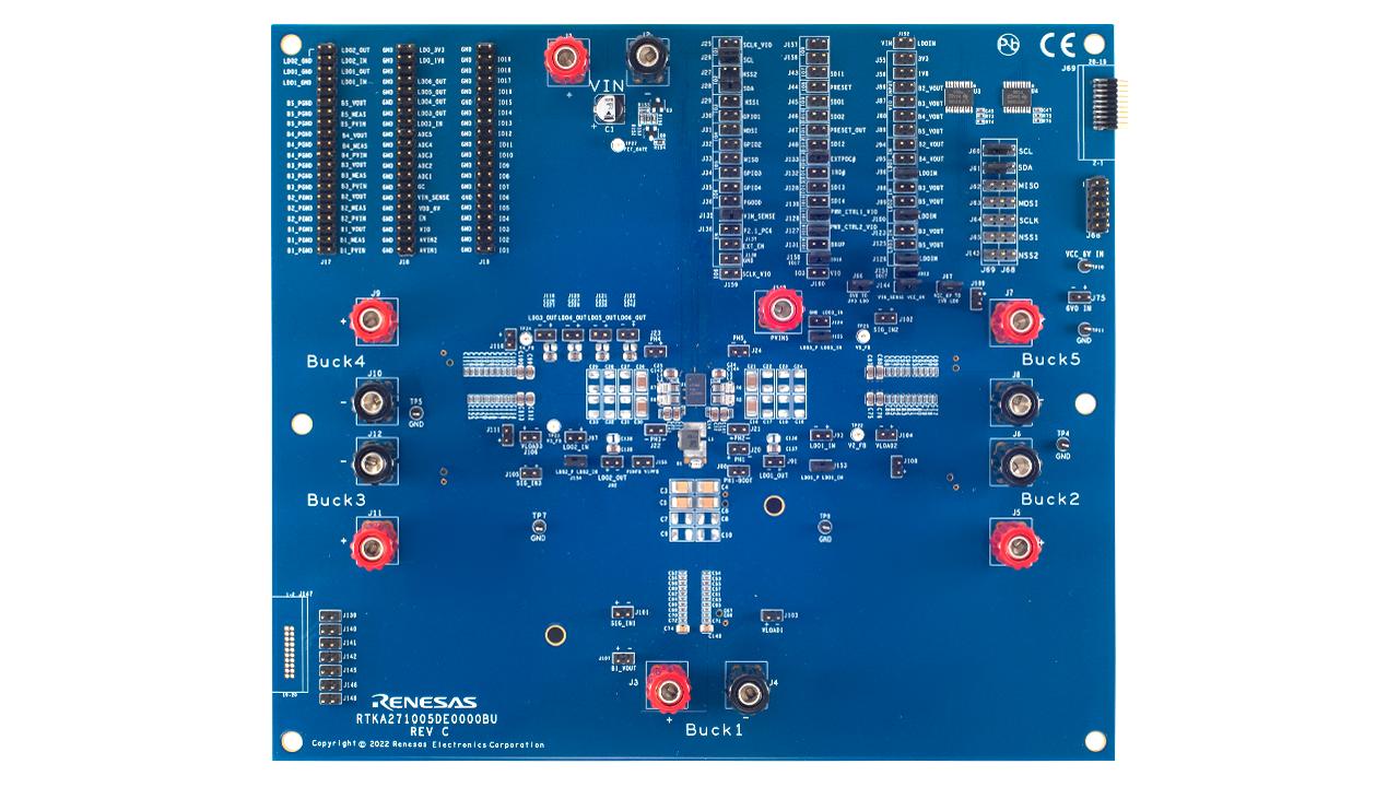 The RTKA271005DE0000BU evaluation board provides a quick and comprehensive method for evaluating the RAA271005. The RAA271005 is a versatile automotive power management IC (PMIC) that is designed for a range of applications, including vehicle computers, communication gateways, and domain servers. It integrates five high-efficiency DC/DC switching regulators and six LDO (lowdropout) regulators.