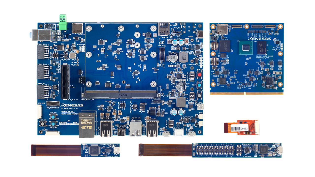 RZ/G3E 评测板套件由模块板 (SOM) 和扩展板组成,是评测 RZ/G3E MPU 功能的理想之选。 模块板符合 SMARC v2.1 标准,是基于模块板进行产品开发的良好参考。