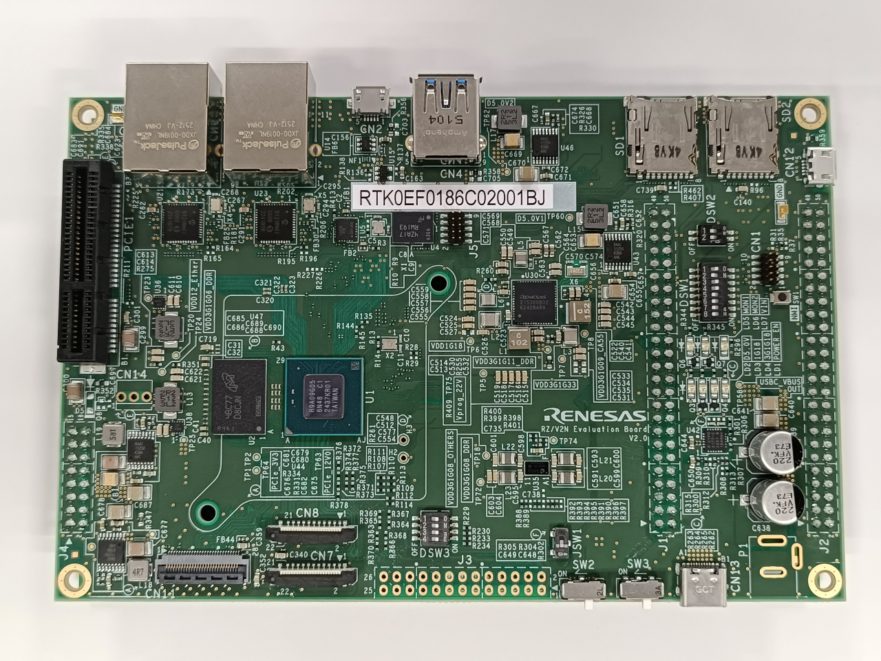 RZ/V2N AI MPU 评测套件 (RTK0EF0186C03000BJ) 用于评测我们的 RZ/V2N 四核 视觉 AI MPU。 该套件包括一块 CPU 评测板、扩展 (EXP) 板和两块子板。 我们提供了 AI 软件开发包 (AI SDK) 作为该评测套件的软件开发环境。 它支持对低功耗 AI 推理、视频流和其他内置功能进行评测。 该套件还支持图像信号处理器 (ISP)、3D 图形引擎 (GE3D) 和可信安全 IP 等可选功能。