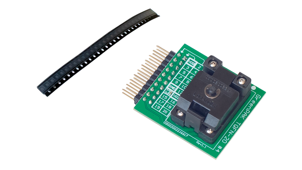 - TQFN-20 socket for the SLG46580 GreenPAK™ programmable mixed-signal matrix