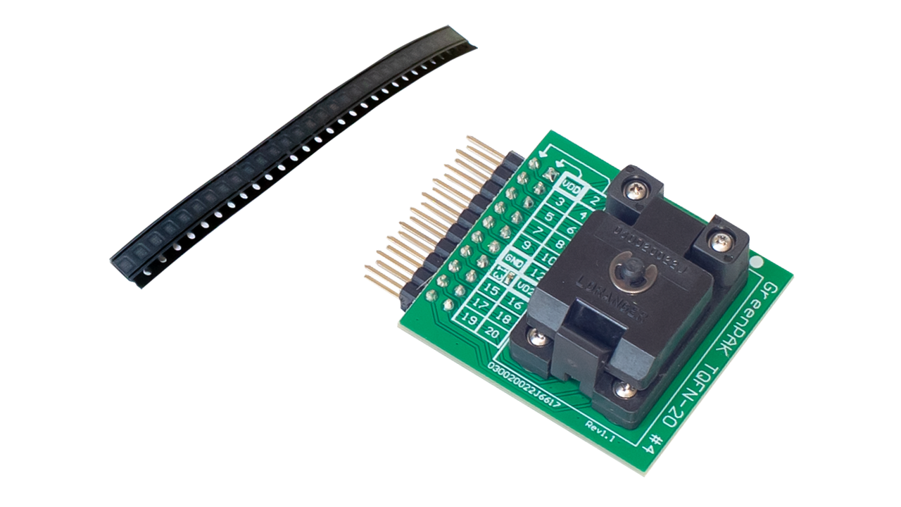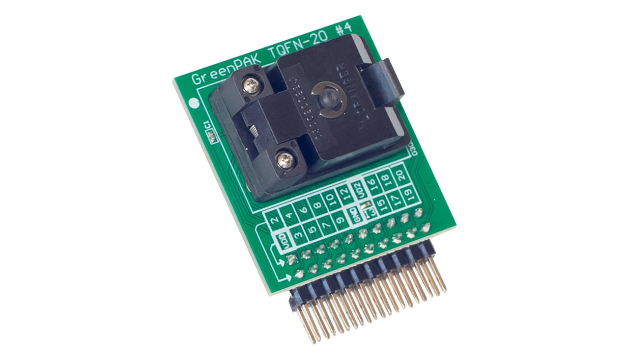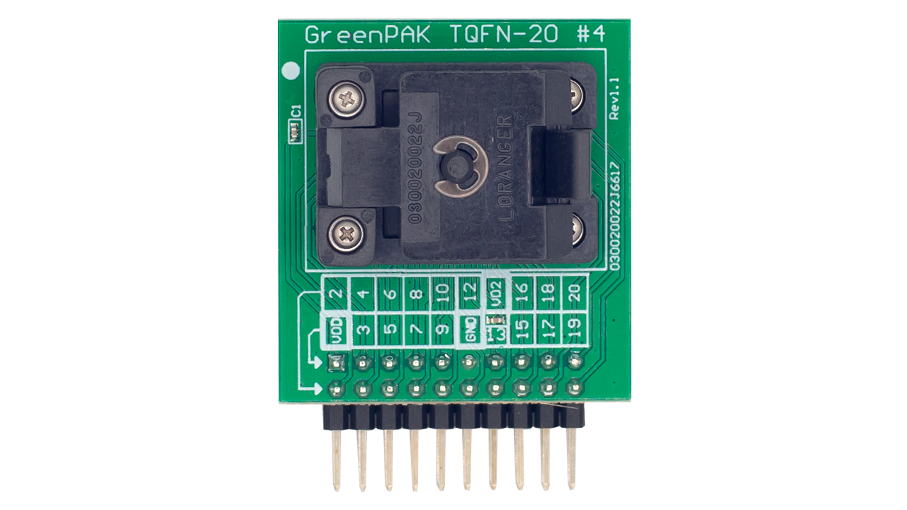 - TQFN-20 socket for the SLG46826-EV GreenPAK programmable mixed-signal matrix