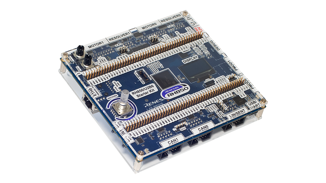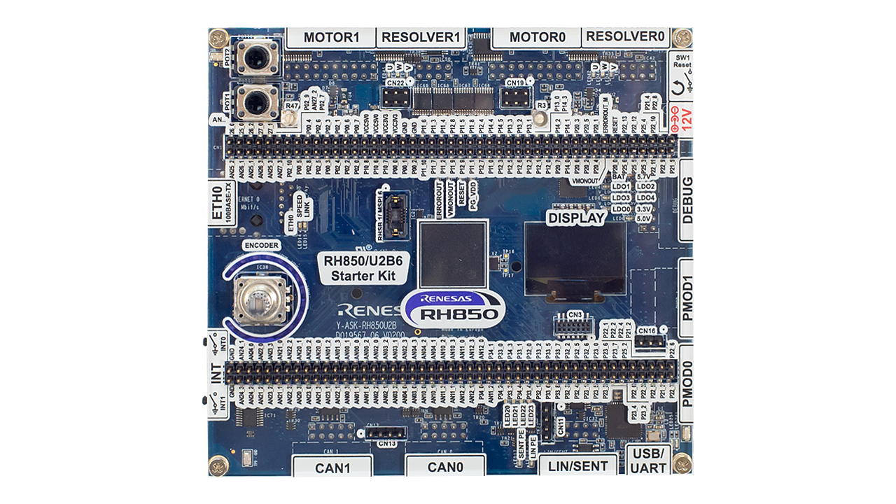 The kit includes a 12V power supply with the ASIL D-compliant RAA271084 PMIC for safe, reliable operation. Debugging is simple with a 14-pin LPD/JTAG debug port. Connectivity options include Ethernet, two CAN FD channels for high-speed communication, and LIN/SENT interfaces for sensor integration. Two Pmod™ connectors support I2C/SPI expansion for easy prototyping. The kit also features a 128×64 OLED display, LEDs, and a rotary encoder with RGB lighting for interactive feedback. Analog inputs, along with motor control and resolver I/Os, enable robust testing. Optimized for motor control, it supports advanced drive systems such as electric power steering and traction control.