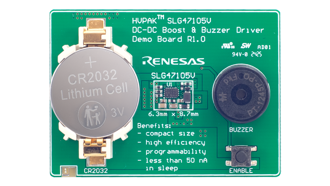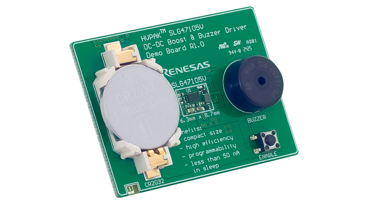 This video demonstrates the HVPAK SLG47105 DC/DC Boost and Buzzer Driver Demo Board. The demo board operates with a single 3V CR2032 battery. It consumes less than 50nA in sleep mode, ensuring long device operation on a single charge.