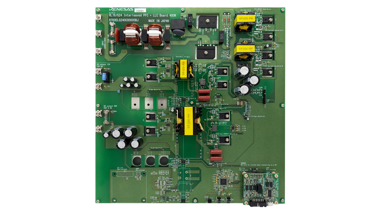 RL78/G24 交错式 PFC + LLC 400W 是一款基于 RL78/G24 微控制器的数字电源控制开发与评估套件。RL78/G24 是一款面向实时控制应用的低功耗 16 位 MCU。 通过单颗 MCU 即可同时控制 PFC 级和双通道 LLC 谐振变换器,从而实现高效率、紧凑型的数字电源解决方案。