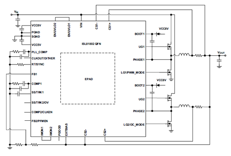 ISL81802作为业界第一款80伏双路输出支持交错并联的两相同步降压控制器, 支持4.5V~80V输入,用OVP(过压), OCP(过流), OTP(过温), UVP(欠压),Shoot-Thru(直通)全故障保护确保高可靠性,另外具备两路独立使能和软起动。
