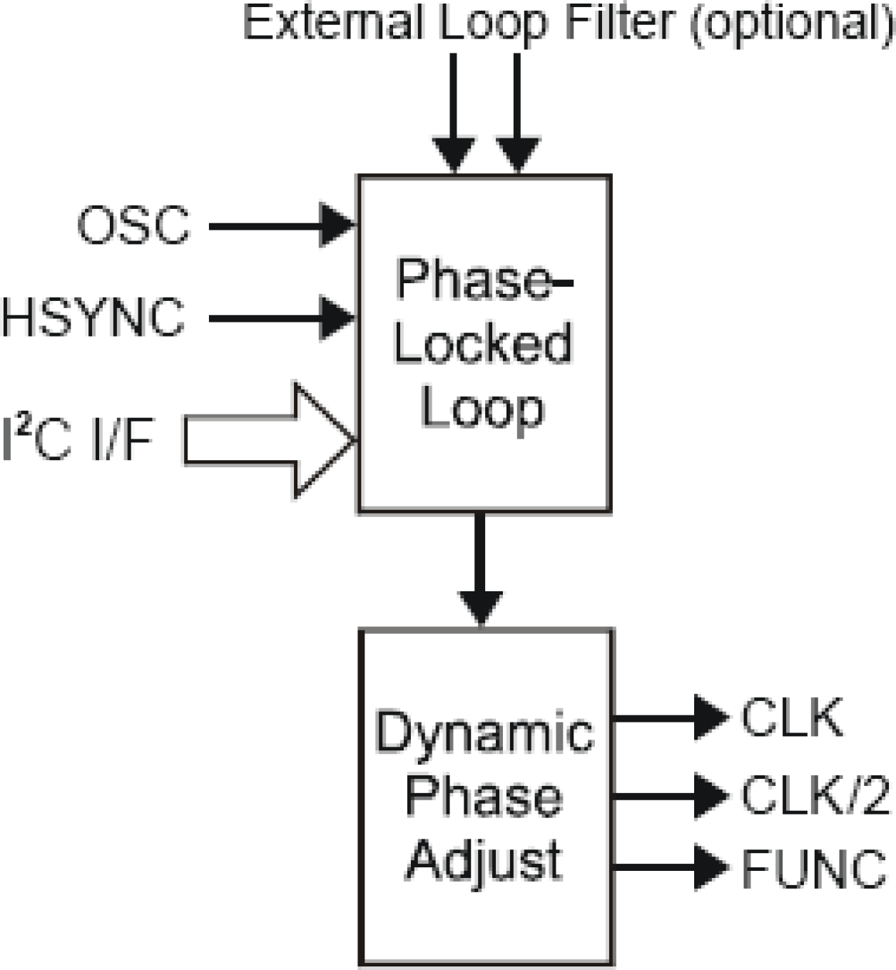 The 1523 is a low-cost, high-performance frequency generator. It is well suited to general purpose phase controlled clock synthesis as well as line-locked and genlocked high-resolution video applications. Using IDT's advanced low-voltage CMOS mixed-mode technology, the 1523 is an effective phase controlled clock synthesizer and also supports video projectors and displays at resolutions from VGA to beyond UXGA. The 1523 offers clock outputs in both differential (to 250 MHz) and single-ended (to 150 MHz) formats. Dynamic Phase Adjust (DPA) allows I2C™ control of the output clock's phase relative to the input sync signal. A second, half speed set of outputs that can be separately enabled allows such applications as clocking analog-to-digital converters. The FUNC pin provides either the regenerated input from the phase-locked loop (PLL) divider chain output, or the input HSYNC after being sharpened by the Schmitt trigger. Both signals are then delayed by the DPA. The advanced PLL uses either its internal programmable feedback divider or an external divider. Either the internal or external loop filters is software selectable. The COAST input pin disables the PLL's charge pump, causing the device to idle at the current speed for short periods of time, such as vertical blanking intervals. The device is programmed by a standard I2C-bus serial interface and is available in a 24-pin, wide small-outline integrated circuit (SOIC) package.