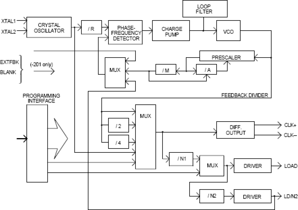 The 1562B is a very high performance monolithic phaselocked loop (PLL) frequency synthesizer. Utilizing ICS's advanced CMOS mixed-mode technology, the 1562B provides a low cost solution for high-end video clock generation. The 1562B has differential video clock outputs (CLK+ and CLK-) that are compatible with industry standard video DAC. Another clock output, LOAD, is provided whose frequency is derived from the main clock by a programmable divider. An additional clock output is available, LD/N2, which is derived from the LOAD frequency and whose modulus may also be programmed. Operating frequencies are fully programmable with direct control provided for reference divider, prescaler, feedback divider and post-scaler. Reset of the pipeline delay on Brooktree RAMDAC?s may be performed under register control. Outputs may also be set to desired states to facilitate circuit board testing.