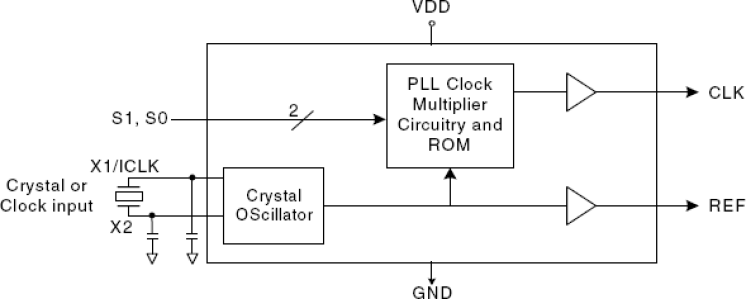 The 502 Loco™ is the most cost effective way to generate a high-quality, high-frequency clock output and a reference from a lower frequency crystal or clock input. The name LOCO stands for Low Cost Oscillator, as it is designed to replace crystal oscillators in most electronic systems. Using Phase-Locked Loop (PLL) techniques, the device uses a standard fundamental mode, inexpensive crystal to produce output clocks up to 160 MHz. Stored in the chip's ROM is the ability to generate six different multiplication factors, allowing one chip to output many common frequencies (see table on page 2). This product is intended for clock generation. It has low output jitter (variation in the output period), but input to output skew and jitter are not defined or guaranteed. For applications which require defined input to output skew, use the 570B.