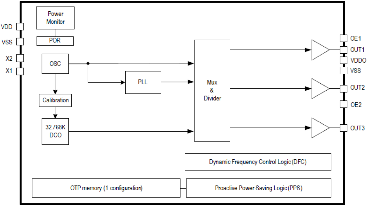 An internal one-time programmable (OTP) memory allows the user to store up to four independent configurations that can be loaded on power-up without programming. The 5L1503 supports three LVCMOS type outputs with VDDO 1.8V, as well as various amplitude clocks. A low-power 32.768kHz clock is supported with only less than 1μA current consumption for system RTC reference clock needs.