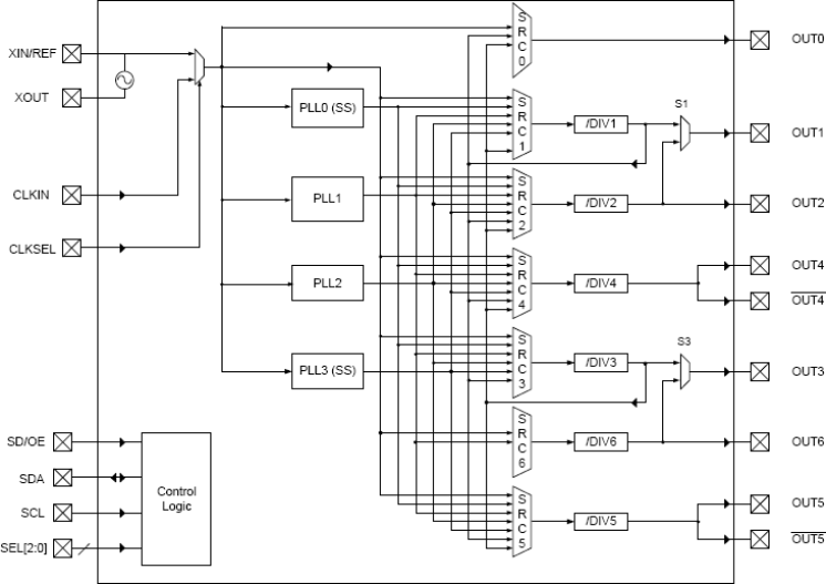 - Each PLL has a 7-bit reference divider and a 12-bit feedback-divider
