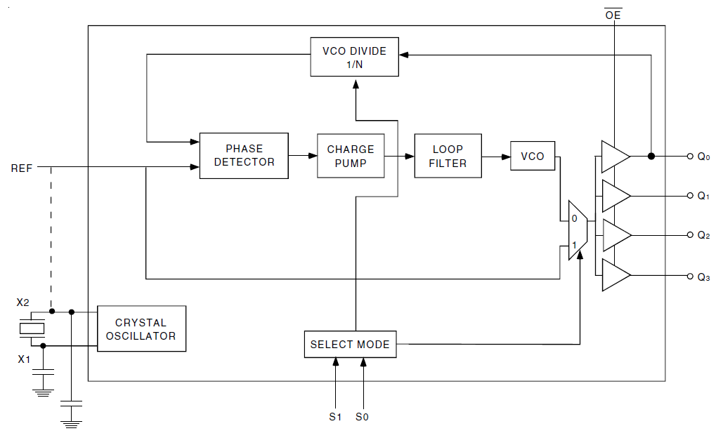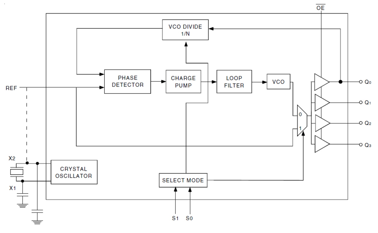 - Internal PLL feedback (loading feedback output relative to other outputs, adjusts propagation delay between REF inputs and outputs)