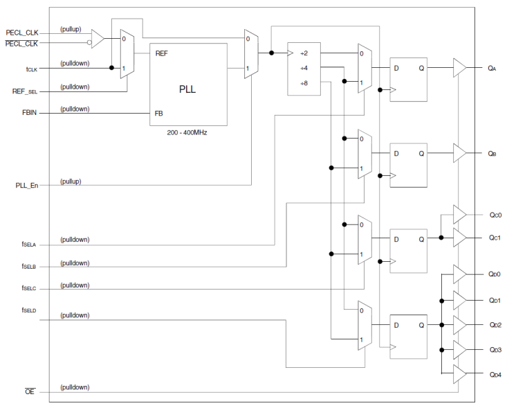 The 5V9351 is a high performance, zero delay, low skew, phase-lock loop (PLL) clock driver. It has four banks of configurable outputs. The 5V9351 uses a differential PECL reference input and an external feedback input. These features allow the 5V9351 to be used as a zero delay, low skew fan-out buffer. REF_SEL allows selection between PECL input or TCLK, a CMOS clock driver input. If PLL_EN is set to low and REF_SEL to high, it will bypass the PLL. By doing so, the 5V9351 will be in clock buffer mode. Any clock applied to TCLK will be divided down to four output banks. When PLL_EN is set high, PLL is enabled. Any clock applied to TCLK will be clocked in both phase and frequency to FBIN. PECL clock is activated by setting REF_SEL to low.