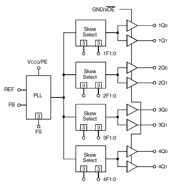 The 5V991A is a high fanout 3.3V PLL based clock driver intended for high performance computing and data-communications applications. Akey feature of the programmable skew is the ability of outputs to lead or lag the REF input signal. The 5V991A has eight programmable skew outputs in four banks of 2. Skew is controlled by 3-level input signals that may be hard-wired to appropriate HIGH-MID-LOW levels. When the GND/sOE pin is held low, all the outputs are synchronously enabled. However, if GND/sOE is held high, all the outputs except 3Q0 and 3Q1 are synchronously disabled. Furthermore, when the VCCQ/PE is held high, all the outputs are synchronized with the positive edge of the REF clock input. When VCCQ/PE is held low, all the outputs are synchronized with the negative edge of REF. Both devices have LVTTL outputs with 12mA balanced drive outputs.