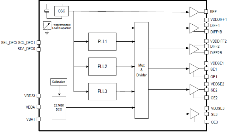 The device has programmable VCO and PLL source selection to allow the user to do power-performance optimization based on the application requirements. It also supports one single-ended output and two pairs of differential outputs that support LVCMOS, LP-HCSL, LVDS, and LVPECL. A low-power 32.768kHz clock is supported with only less than 2μA current consumption for a system RTC reference clock.