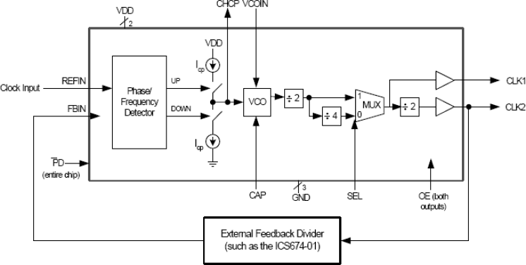 The 673-01 is a low cost, high performance Phase Locked Loop (PLL) designed for clock synthesis and synchronization. Included on the chip are the phase detector, charge pump, Voltage Controlled Oscillator (VCO), and two output buffers. One output buffer is a divide by two of the other. Through the use of external reference and VCO dividers (the 674-01), the user can customize the clock to lock to a wide variety of input frequencies. The 673-01 also has an output enable function that puts both outputs into a high-impedance state. The chip also has a power down feature which turns off the entire device. For applications that require low jitter or jitter attenuation, see the MK2069. For a smaller package, see the 663.