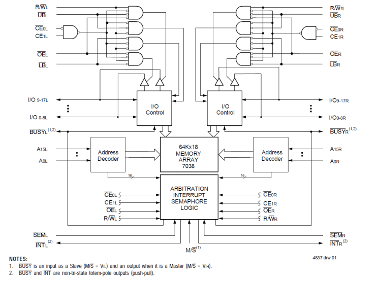 The 7038 is a high-speed 64K x 18 Dual-Port Static RAM designed to be used as a stand-alone 1152K-bit Dual-Port RAM or as a combination MASTER/SLAVE Dual-Port RAM for 36-bit or more word systems. This MASTER/SLAVE approach in 36-bit or wider memory system applications results in full-speed, error-free operation without the need for additional discrete logic. An automatic power down feature controlled by Chip Enable (CE) permits the on-chip circuitry of each port to enter a very low standby power mode.