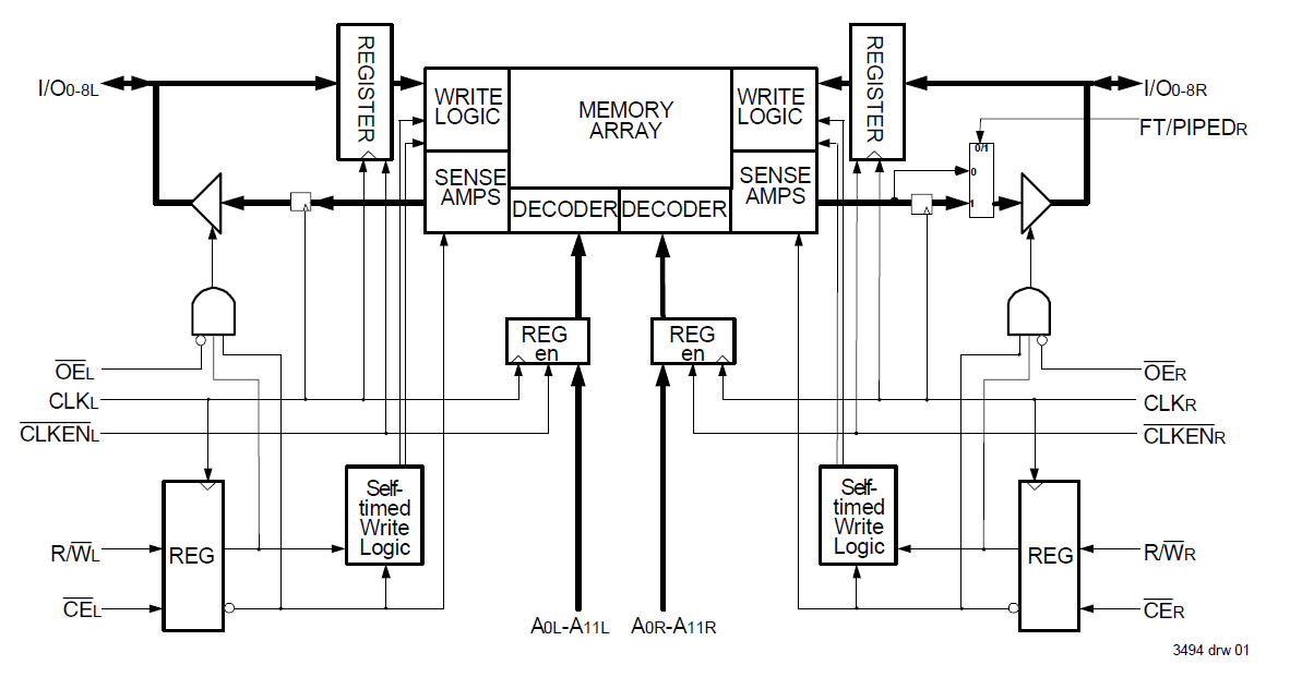 The 709149 is a high-speed 4K x 9 bit synchronous Dual-Port SRAM that has been optimized for applications having unidirectional data flow or bi-directional data flow in bursts, by utilizing input data registers. The 709149 utilizes a 9-bit wide data path to allow for parity which is useful in data communication applications where it is necessary to use a parity bit for transmission/ reception error checking. An automatic power down feature, controlled by CE, permits the on-chip circuitry of each port to enter a very low standby power mode.