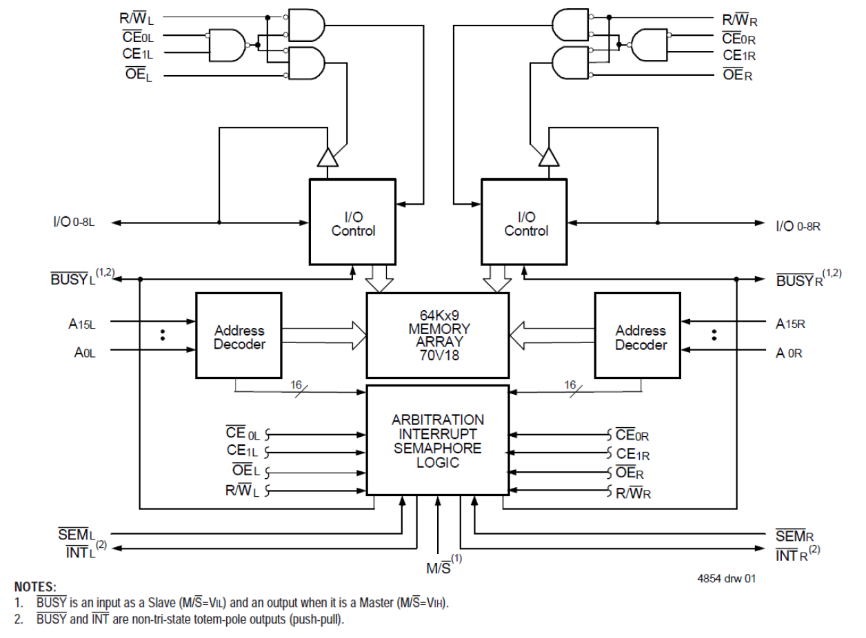 The 70V18 is a high-speed 64K x 9 Dual-Port Static RAM designed to be used as a stand-alone 576K-bit Dual-Port SRAM or as a combination MASTER/SLAVE Dual-Port SRAM for 18-bit-or-more word systems which results in full speed, error-free operation without the need for additional discrete logic. An automatic power down feature controlled by the chip enables (either CE0 or CE1) permit the on-chip circuitry of each port to enter a very low standby power mode.