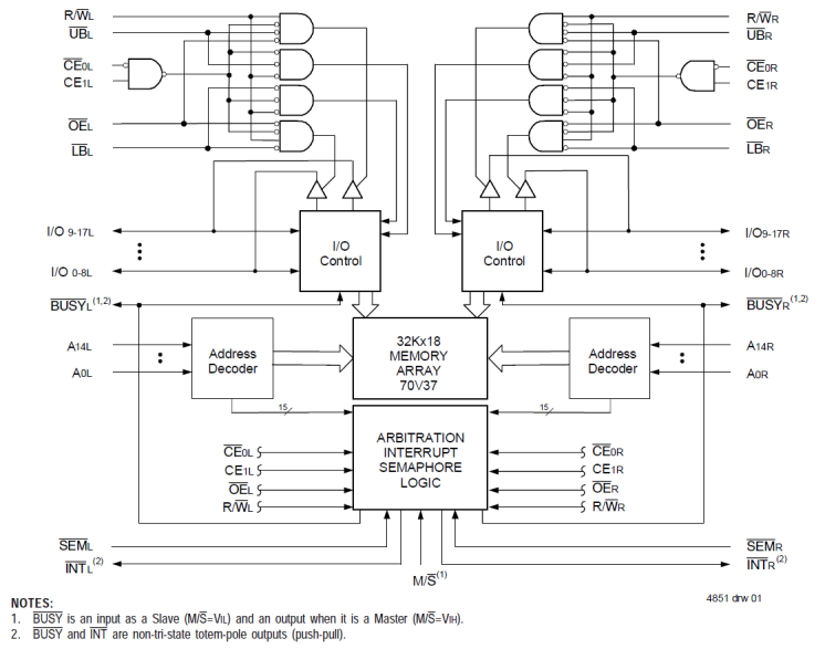 The 70V37 is a high-speed 32K x 18 dual-port static RAM designed to be used as a stand-alone 576K-bit dual-port RAM or as a combination Master/Slave dual-port RAM for 36-bit or more word systems. This Master/Slave approach in 36-bit or wider memory system applications results in full-speed, error-free operation without the need for additional discrete logic. An automatic power-down feature controlled by the Chip Enable (CE) permits the on-chip circuitry of each port to enter a very low standby power mode.