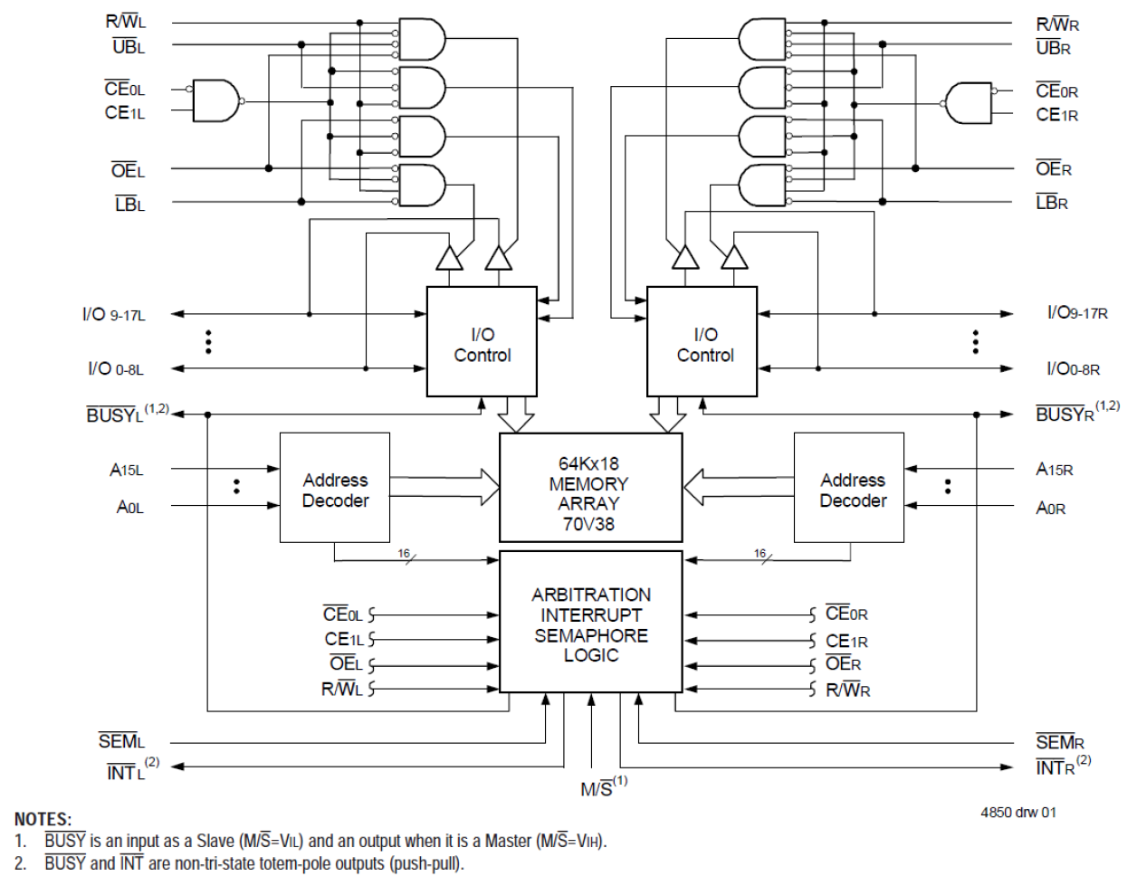 The 70V38 is a high-speed 64K x 18 Dual-Port Static RAM designed to be used as a stand-alone 576K-bit Dual-Port RAM or as a combination MASTER/SLAVE Dual-Port RAM for 36-bit or more word systems. This MASTER/SLAVE approach in 36-bit or wider memory system applications results in full-speed, error-free operation without the need for additional discrete logic. An automatic power down feature controlled by Chip Enable (CE) permits the on-chip circuitry of each port to enter a very low standby power mode.