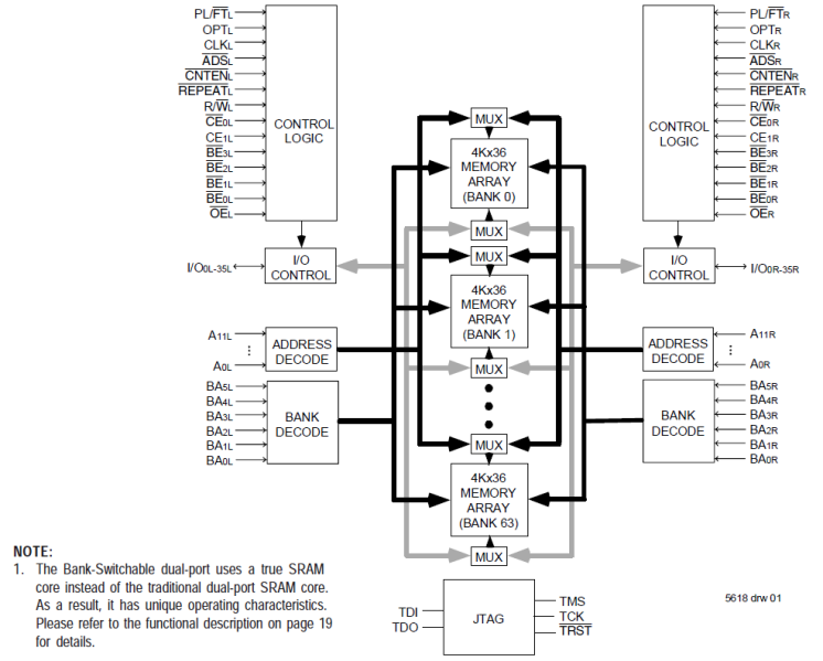 The 70V7519 is a high-speed 256K x 36 (9Mbit) synchronous Bank-Switchable Dual-Ported SRAM is organized into 64 independent 4Kx36 banks and has two independent ports with separate control, address, and I/O pins for each port, allowing each port to access any 4Kx36 memory block not already accessed by the other port. An automatic power down feature, controlled by CE0 and CE1, permits the on-chip circuitry of each port to enter a very low standby power mode.