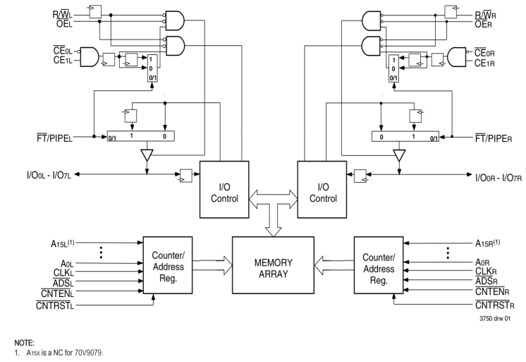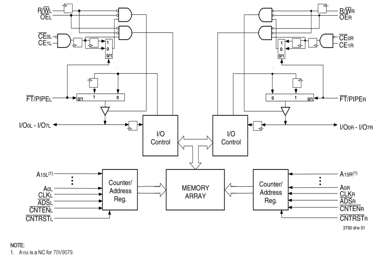 - Flow-through or pipelined output mode on either port via the FT/PIPE pin