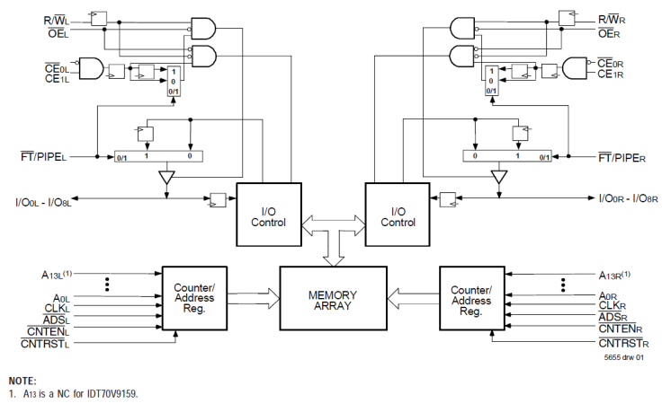 - Flow-through or Pipelined output mode on either port via the FT/PIPE pin