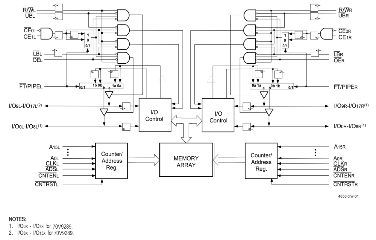 - Flow-through or pipelined output mode on either port via the FT/PIPE pin