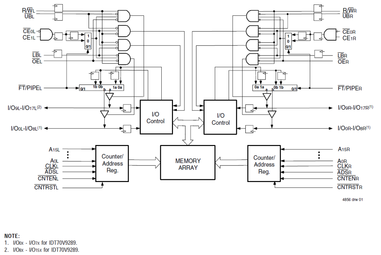 - Flow-through or Pipelined output mode on either port via the FT/PIPE pin