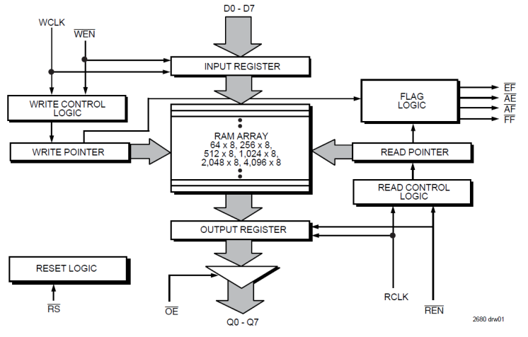 The 72240 is a 4K x 8 SyncFIFO™ with clocked read and write controls. This FIFO is useful for a wide variety of data buffering needs, such as graphics, Local Area Networks (LANs), and interprocessor communication. It has 8-bit input and output ports. The Read Clock can be tied to the Write Clock for single clock operation or the two clocks can run asynchronous of one another for dual clock operation.