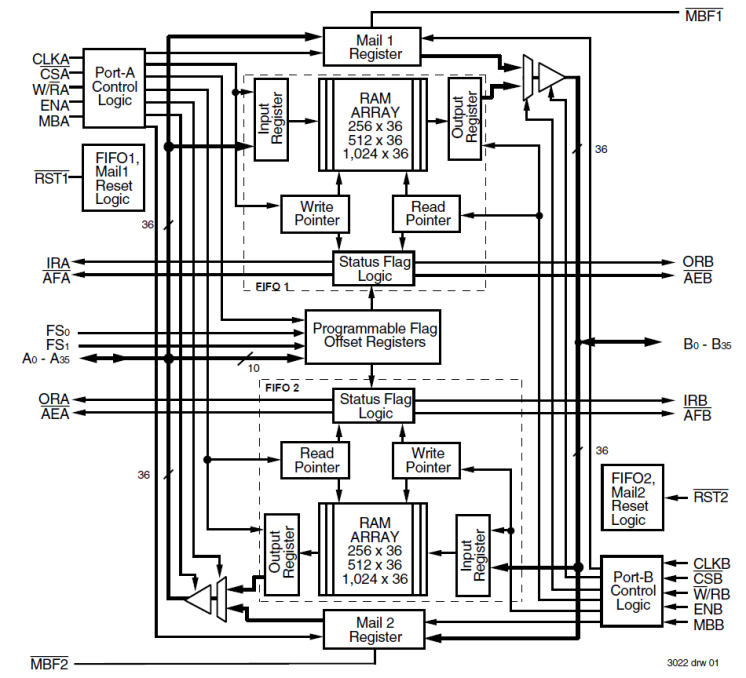 The 723622 is a monolithic Bidirectional SyncFIFO (clocked) memory. Two independent 256 x 36 dual-port SRAM FIFOs on board each chip buffer data in opposite directions. Communication between each port may bypass the FIFOs via two 36-bit mailbox registers. The enables for each port are arranged to provide a simple bidirectional interface between microprocessors and/or buses with synchronous control.