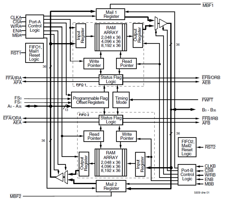 - Free-running CLKA and CLKB may be asynchronous or coincident (simultaneous reading and writing of data on a single clock edge is permitted)