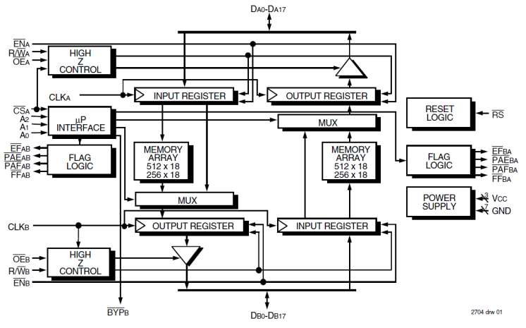 The 72615 is a 512 x 18 x 2 bidirectional First-In/First-Out memory, with synchronous interface for fast read and write cycle times. The SyncBiFIFO™ is a data buffer that can store or retrieve information from two sources simultaneously. Two Dual-Port FIFO memory arrays are contained in the SyncBiFIFO; one data buffer for each direction. The SyncBiFIFO has registers on all inputs and outputs. Data is only transferred into the I/O registers on clock edges, hence the interfaces are synchronous.