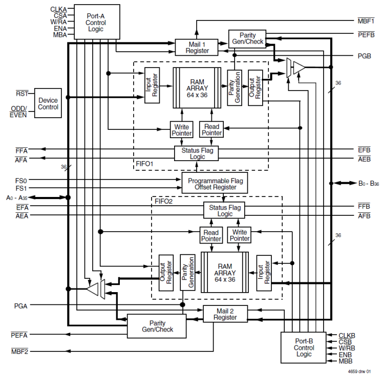 The 72V3612 is a 3.3V version of the 723612. Two independent 64 x 36 dual-port SRAM FIFOs on board the chip buffer data in opposite directions. Communication between each port can bypass the FIFOs via two 36-bit mailbox registers. The enables for each port are arranged to provide a simple bi-directional interface between microprocessors and/or buses with synchronous control.